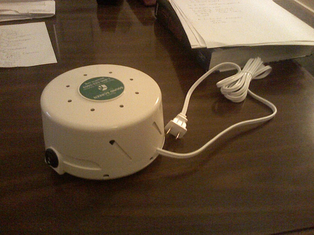 I meant to show you all one of the most ridiculous things I had ever seen. As you may know, another fella in the math dept. is not at all pleased with the new rooms we have. He evidently asked several times that the rooms be soundproof so that he would not be disturbed while waxing mathematic. Well, long story short, the rooms are (of course) not sound proof and he made quite a stink about it. The real drag for me is that the room opposite his is mine and so he has been dragging me into the mess insinuating that I too am not able to do any work because of the lack of absolute silence. I’m stuck between a rock and a hard place. On the one side, I have to work in the same department with this guy, so I don’t want to tell him to leave me out of it. On the other hand, I don’t want to buck the administration either. *sigh* At any rate, during the last meeting which included the science division chair, the head of the builiding and operations department, and the provost of the school (second, third, and fourth in the school’s hierarchy only leaving out the president) it was made quite clear that they were not willing to spend any more money trying to soundproof the walls. They had evidently already double insulated the dividing wall and done some extra duct work in the ceiling. In a last ditch effort a white noise generator was suggested. These things are supposed to supply ambient background noise that would lessen the effect of sharp spikes in noise. Whatever. Well, they came in the other day. I didn’t know it, but I got one too. Check it out.